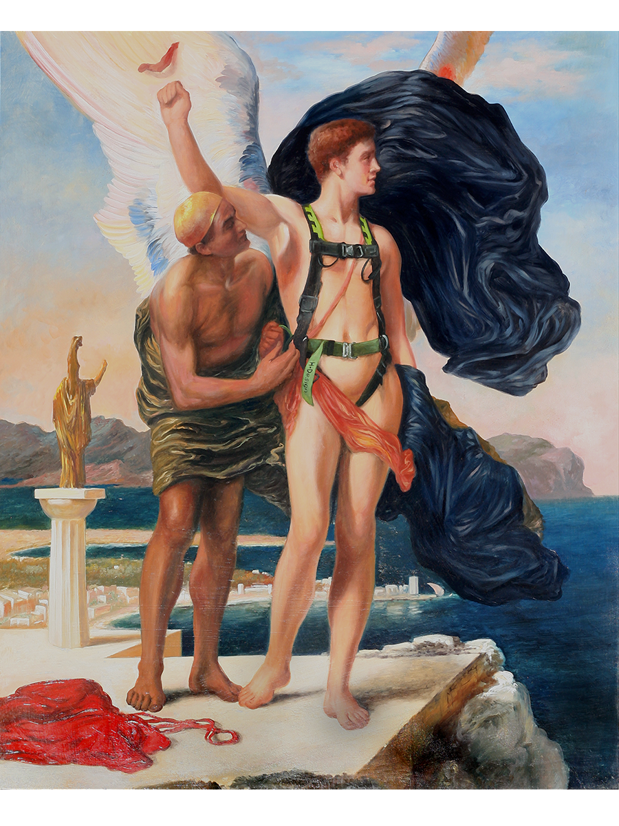 Dedalo è intento a stringere sul corpo scultoreo di Icaro le ali che ha creato con piume e cera, mentre gli impartisce le ultime raccomandazioni sul volo: i gesti del padre fanno trapelare tutta la sua apprensione mentre il figlio, con lo sguardo già proiettato verso il futuro, sembra animato da una trepidante attesa.