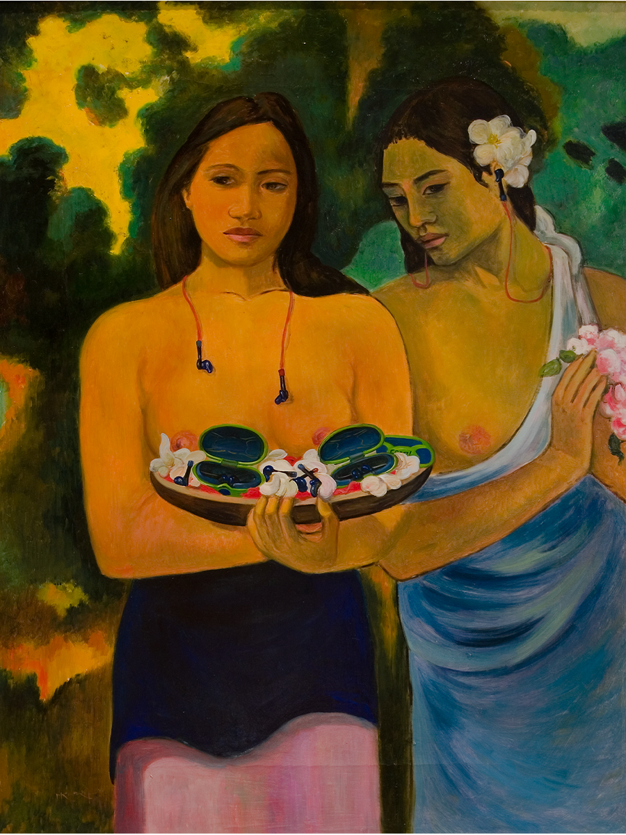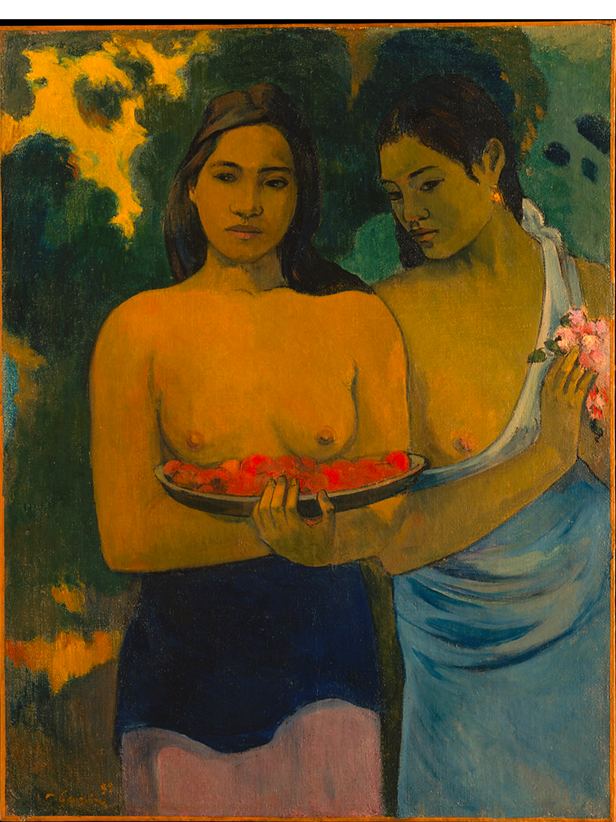 vicine ma distanti nei loro sguardi pensierosi. Il naturale di Gauguin è misterioso nella sua sensualità, lontano dai canoni occidentali e per questo di grande fascino. In un mondo esclusivamente composto da animali, alberi e onde, la (semi)nudità delle ragazze tahitiane appare come perfettamente naturale, mai forzata, una scelta in armonia con uno stile di vita privo di vincoli.